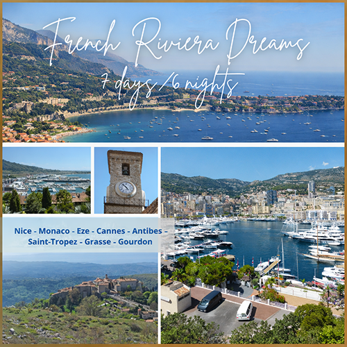 - Cities: Nice – Monaco – Eze – Cannes – Antibes – Saint-Tropez – Grasse – Gourdon